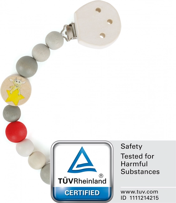 Zahvaljujući praktičnom klipu dudu lako pričvrstite na odjeću, kolica ili autosjedalicu, pa ne pada na pod i ne gubi se. Prirodne drvene perlice u nježnim bojama ugodne su dječjim rukama i očima te pomažu razvijati osjetilnu percepciju.