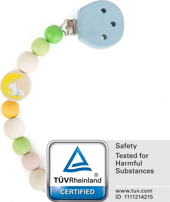 Izrađeno od kvalitetnog drva s glatkom površinom i sigurnim bojama bez štetnih tvari. Otpornost na slinu i robusna izrada osiguravaju dug vijek trajanja. Univerzalna omčica pristaje na većinu duda s prstenom.