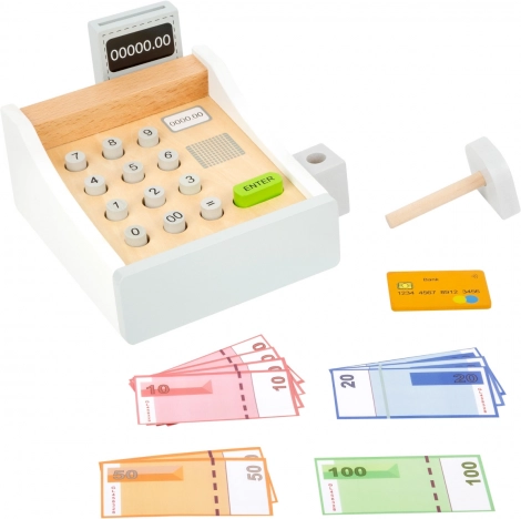 Stilska drvena blagajna u bijeloj boji potiče igru uloga, razvija osnove matematike i uči djecu rukovanju novcem. Sadrži skener, čitač kartica, igraće novčanice i drvenu kreditnu karticu – sve pregledno pohranjeno u ladici. Idealan dodatak svakom dječjem dućanu.