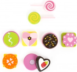 Otkrijte čaroliju slatke igre s raznobojnim setom drvenih poslastica SMALL FOOT. Lizalice, keksi i praline izrađeni su od 100% certificiranog FSC drva te ih djeca zahvaljujući čvrstim čičak-trakama mogu neprestano razdvajati i spajati. Realistični dodaci pretvaraju svaku dječju kuhinju u kreativnu slastičarnicu.