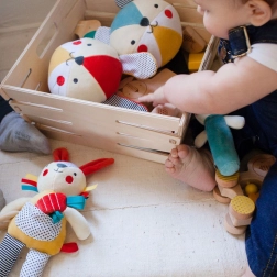 Dizajn PETIT COLLAGE kombinira kontrastne uzorke i žive boje za vizualnu stimulaciju, dok lagana konstrukcija olakšava držanje malim ručicama. Održiv izbor za roditelje koji traže sigurnu i ekološku igračku za novorođenče.