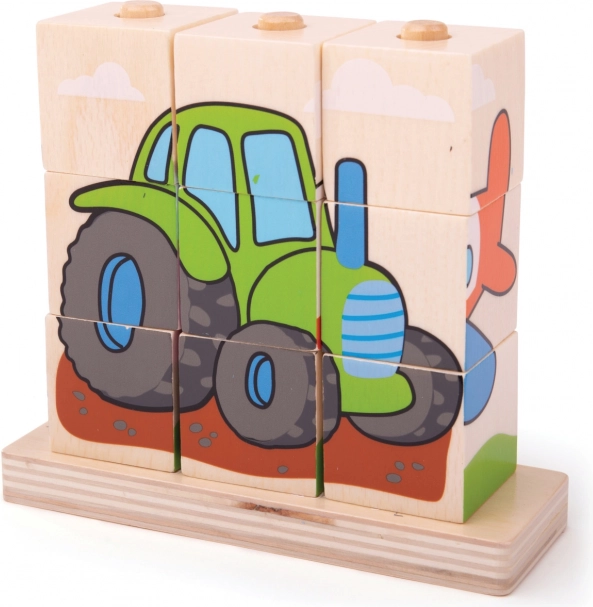 Drveni puzzle Bigjigs Baby Prijevozna sredstva je idealna igračka za razvoj motorike i koordinacije ruku i očiju kod djece. Sadrži 10 komada drvenih blokova s četiri scene prijevoza: vlak, auto, traktor i avion.