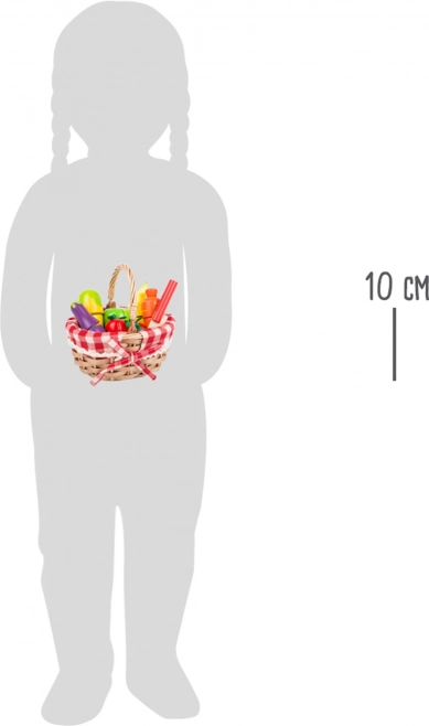 Ovaj kvalitetan set sadrži pletenu košaricu s kariranom tkaninom te drvene komade voća i povrća (jagode, mrkva, patlidžan, kukuruzni klip, jabuka, banana itd.). Dijelovi su spojeni čičak-trakom, pa ih djeca mogu sigurno “rezati” drvenim nožem i ponovno spajati. Savršen dodatak za dječju kuhinju i prodajni štand.