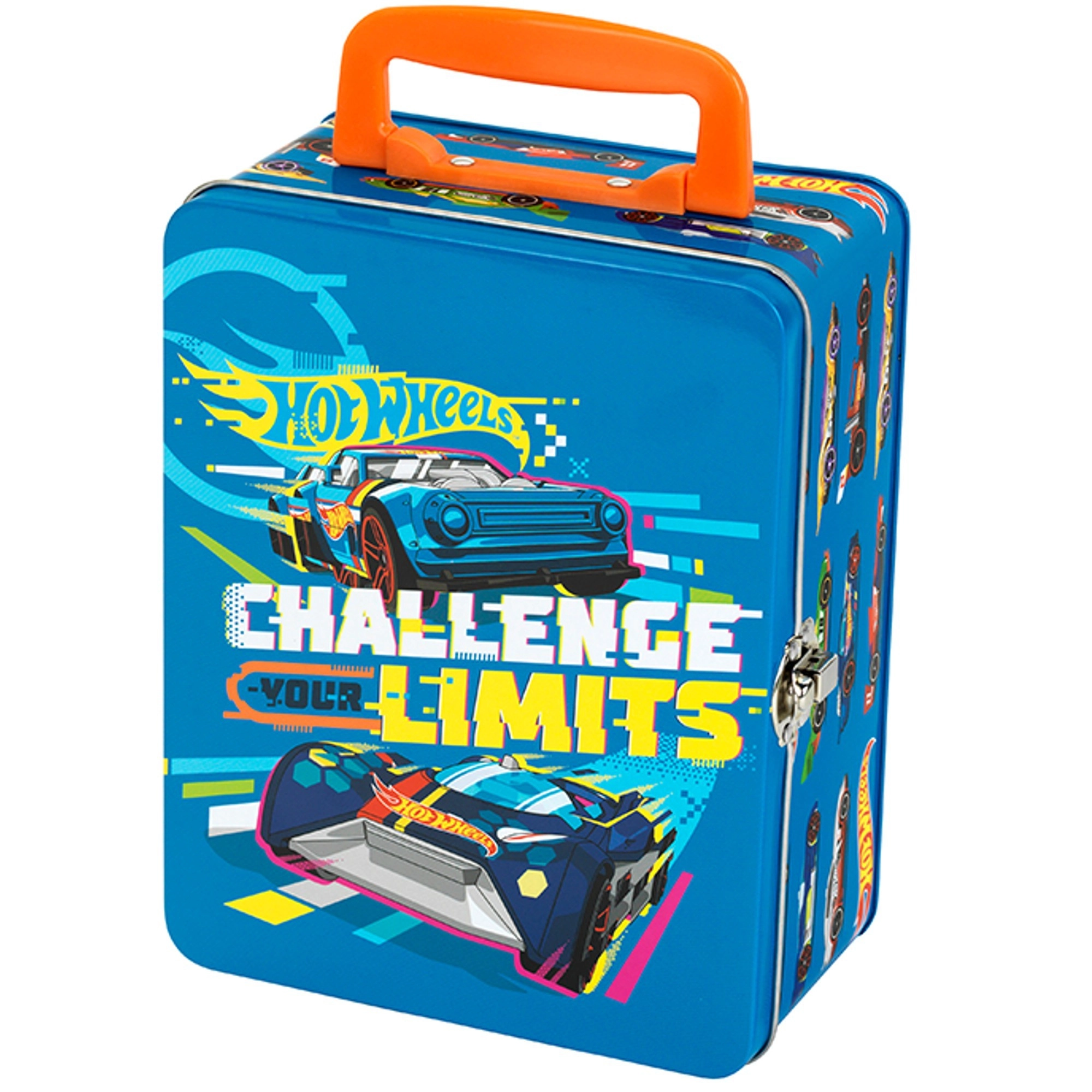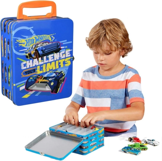 Ovaj stilski plavi kofer s grafikom trkaćih auta i sloganom „Challenge Your Limits” izvrsno je rješenje za sve male kolekcionare. Unutra se nalazi izvadiva mrežica s 18 zasebnih pretinaca koja drži autiće pregledno odvojene i zaštićene. Robusna metalna konstrukcija i pouzdano kopčasto zatvaranje osiguravaju sigurno spremanje pri prenošenju.