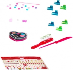 Bogati set pribora uključuje češljeve, četku, šarene ukosnice, perlice, vrpce, naljepnice i paletu u obliku srca za “make-up”. Kosa je meka, gusta i lako se raščešljava, pa podnosi često češljanje i ponovljene frizure bez gubitka kvalitete. U pakiranju se nalaze i slikovite upute za jednostavnu inspiraciju.