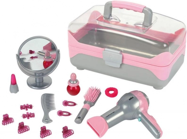 Set je licenciran markom Braun i pakiran je u stilski kovčeg s prozirnim poklopcem za jednostavno skladištenje i red. Kovčeg je izrađen od kvalitetne plastike, ima ergonomsku ručku i kopču koja osigurava njegovo zatvaranje. Svi uređaji odgovaraju stvarnim proizvodima Braun FuturPro Ion-Care i sušilo je opremljeno nastavkom za ravnanje kose. To je savršen set za zahtjevnu, profesionalnu malu frizerku.