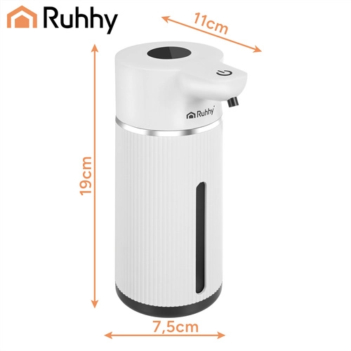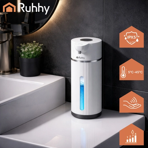 Moderni bezdodirni dozator sapuna RUHHY kapaciteta 420 ml osigurava maksimalnu higijenu zahvaljujući infracrvenom senzoru. Nudi 4 razine doziranja, brz odaziv 0,25 s, LED zaslon za kontrolu stanja te punjivu bateriju 1200 mAh do 5000 doza. Zahvaljujući vodootpornosti IPX5 idealan je za kupaonicu i kuhinju, a praktično USB‑C punjenje olakšava svakodnevnu upotrebu.