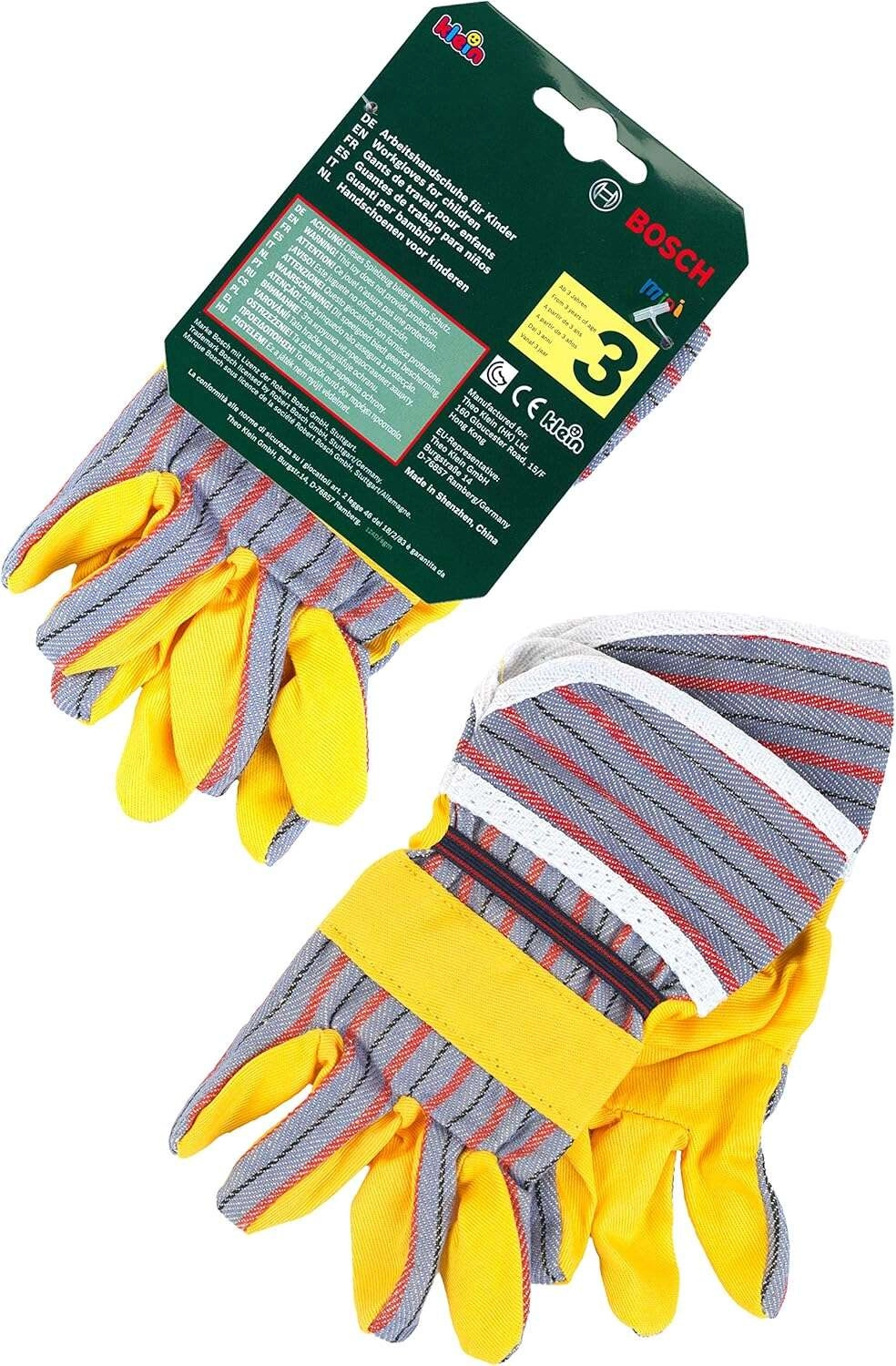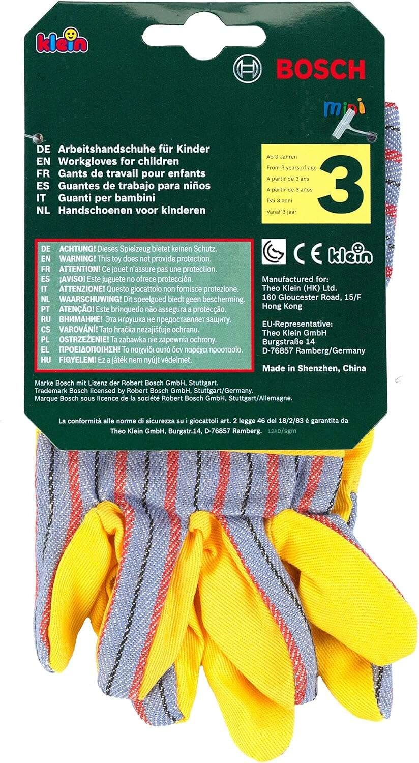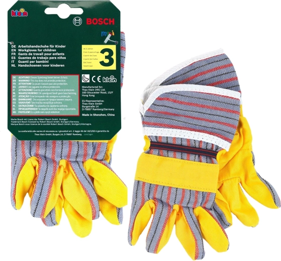 Dječje radne rukavice BOSCH marke Klein izvrstan su dodatak za male majstore. Vjerno oponašaju prave rukavice, imaju žute dlanove sa sivim prugastim elementima, elastične manšete za bolje prianjanje i idealne su za igru uloga majstora i vrtlara.