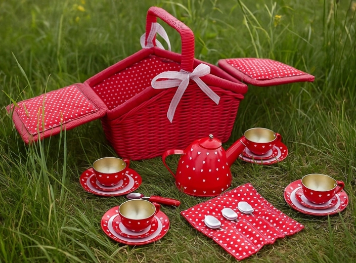 Očaravajuća piknik košara s motivima točkica i srdaca skriva limeni čajni servis spreman za svaku zamišljenu čajanku. Čvrsta izrada s podesivim trakama na čičak i tekstilnim rubom osigurava jednostavno prenošenje i spremanje svih dijelova. Djeca vježbaju društvenu interakciju, motoriku i kreativnost.