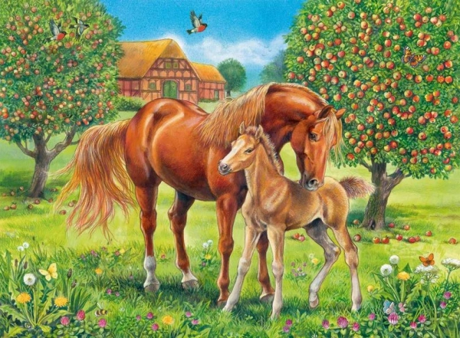 Zabavne puzzle za djecu s motivom prekrasnih konja na pašnjaku nude 100 velikih dijelova za lako slaganje.