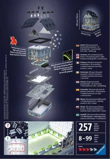 Otkrijte uzbudljivu zabavu s 3D puzzle Ravensburger Sablasna kuća. 216 čvrstih dijelova nakon sastavljanja stvara stabilan model koji svijetli u mraku i pruža satima zabave i vježbe logike djeci od 8 godina i odraslima.