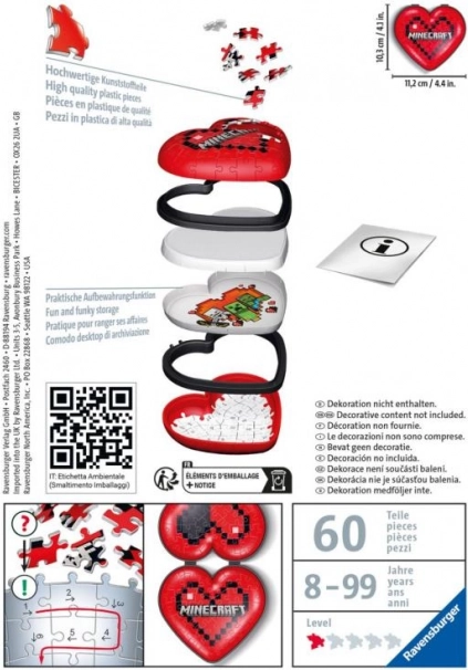 Otkrijte čaroliju svijeta Minecraft s jedinstvenim 3D puzzleom u obliku srca brenda Ravensburger. Set od 54 dijela nudi zabavan izazov za djecu od 6 godina, razvija logičko razmišljanje, strpljenje i finu motoriku te nakon slaganja stvara zanimljivu 3D dekoraciju za dječju sobu.