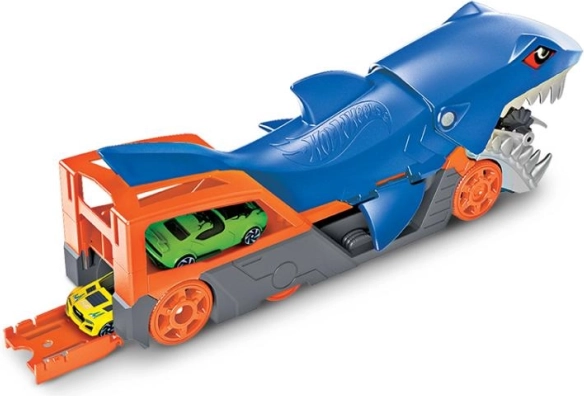 Zabavni Hot Wheels transporter u obliku morskog psa pretvara pospremanje u igru – tijekom vožnje autić doslovno „proždire“ u trbuh, gdje je sigurno pohranjen. Prima do 5 vozila u mjerilu 1:64, ima stražnju preklopnu rampu za lako istovarivanje, a priložen je 1 HOT WHEELS autić. Sjajan poklon za djecu od 4 do 8 godina i odličan način kako skladištiti i prevoziti kolekciju.
