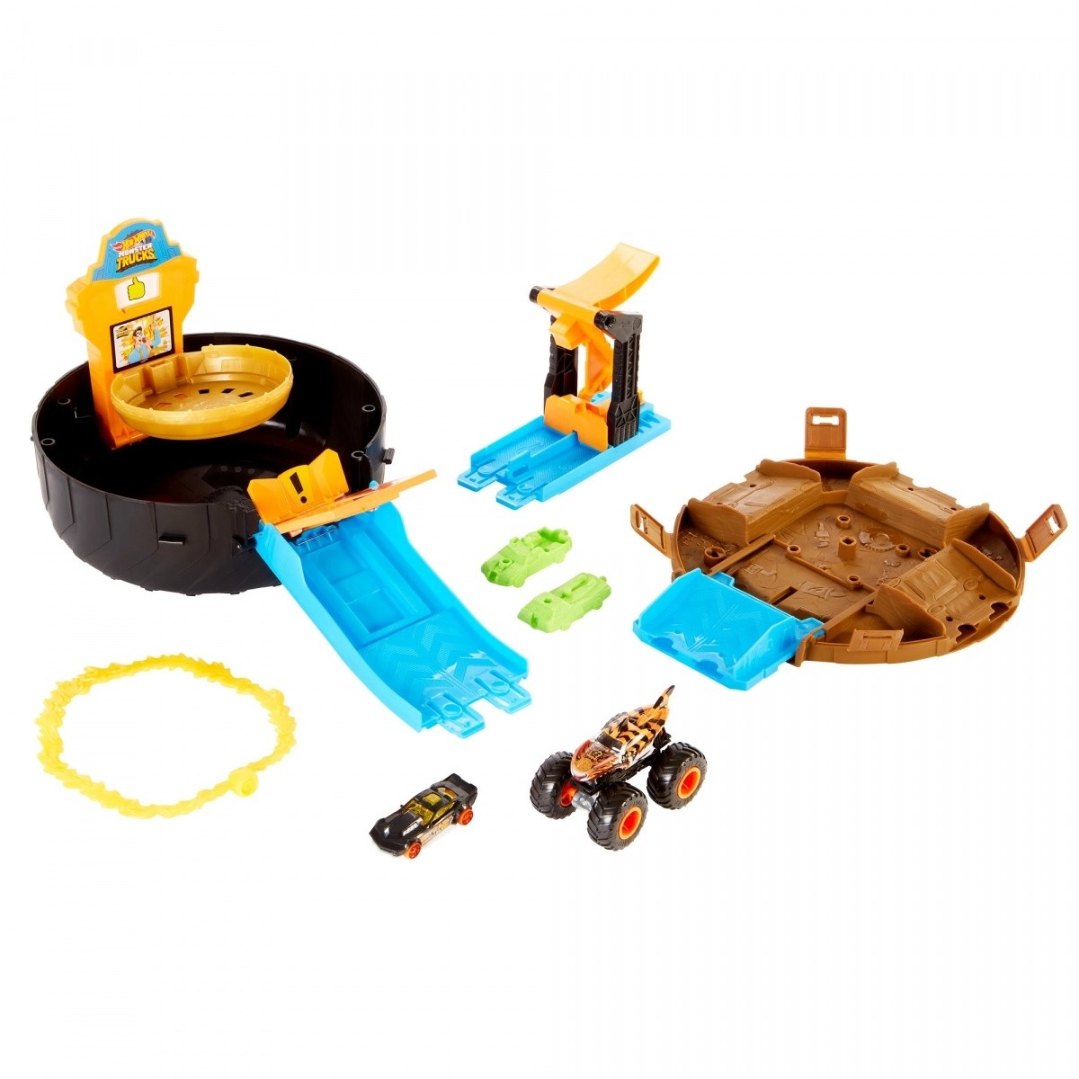 Otvori divovsku gumu i pretvori je u punokrvnu arenu za kaskaderske trikove. Jednim pritiskom lansirnika pošalji vozila niz rampu kroz vatreni prsten – kada slete na pravo mjesto, platforma ih prevrće u krug pobjednika i upisuješ bodove na ploči za rezultat. Idealno za djecu koja vole brzinu, izazove i natjecanje.