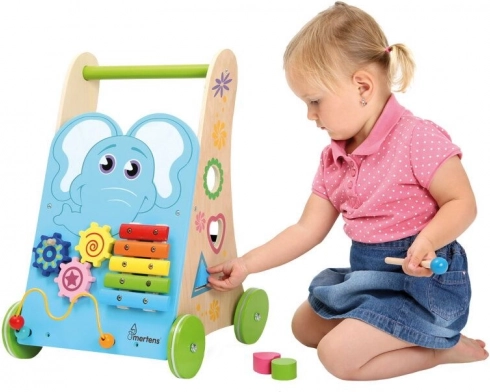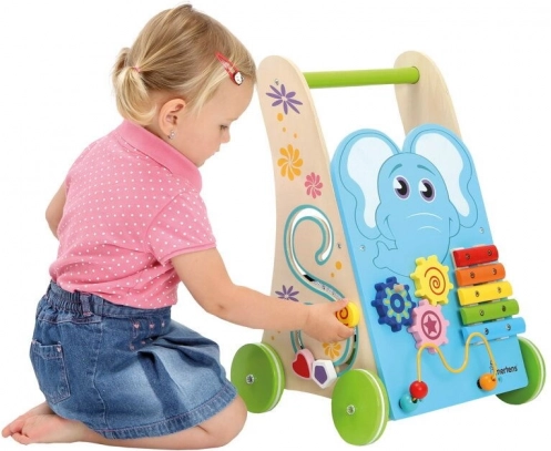 Ksilofon s blagim zvukom, labirint s perlicama, umetaljka i zupčanici razvijaju finu motoriku, logiku i osjećaj za ritam u jednoj igrački.