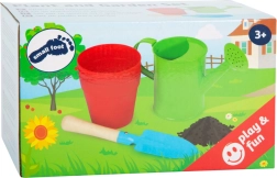 Ovaj šareni dječji vrtlarski set savršen je za prve pokušaje sadnje. Dovoljno je napuniti tegle zemljom, posijati sjemenke i promatrati kako biljke rastu. Metalna lopatica s čvrstom drvenom drškom dobro leži u dječjoj ruci, a mala kantica s ružom osigurava nježno zalijevanje bez prekomjernog natapanja.