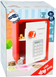 Set sadrži ukupno 68 dijelova – papirnate euro novčanice, zlatnike i srebrnjake te drvene zlatne polugice. Zahvaljujući dimenzijama 20 × 20 × 27 cm trezor je dovoljno prostran za sve dječje dragocjenosti, a ujedno stabilan tijekom igre. Igračka je prikladna od 3 godine i potiče kreativnost, socijalne vještine i igru uloga.