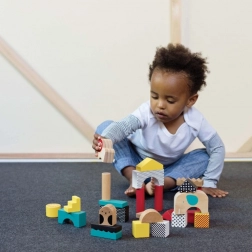 Različiti oblici i veličine kocaka pozivaju na građenje tornjeva, mostova i životinjskih priča. Igra prirodno razvija finu motoriku i koordinaciju ruka-oko.