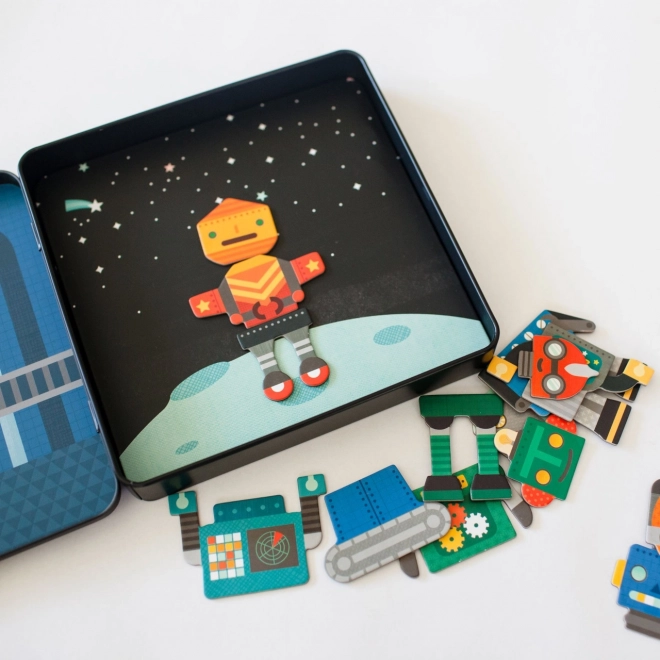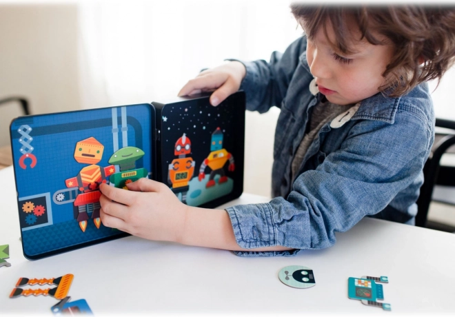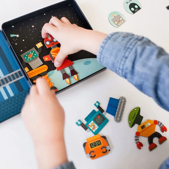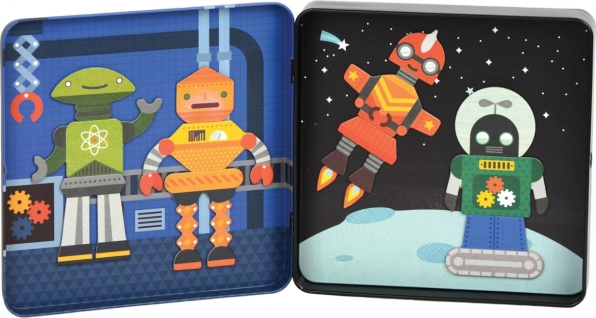 Magnetični set s robotima odlična je zabava za djecu od 3 godine naviše. Zahvaljujući više od 25 magnetskih dijelova, mali konstruktor(i) mogu slagati beskonačne kombinacije robotskih likova i tako razvijati maštu i kreativnost. Metalna kutijica čvrsto se zatvara i u sebi skriva dvije šarene scene na koje se dijelovi lako pričvršćuju.
