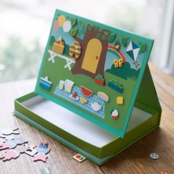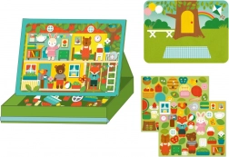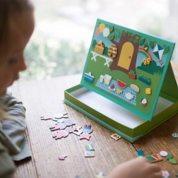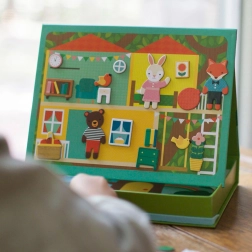 Magnetno kazalište Kuća životinja Petit Collage donosi djeci beskrajne mogućnosti kombiniranja i scena – od ugodnog životinjskog domeka do slatkog piknika u parku. Zahvaljujući graničnicima magnetsku scenu možete lako postaviti, pa se kutija u trenu pretvara u praktično kazališce.