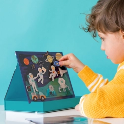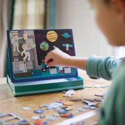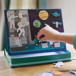 Magnetno svemirsko kazalište donosi djeci beskrajne mogućnosti kombiniranja i stvaranja scena na dvjema magnetskim pozadinama – u svemiru i na svemirskoj postaji. Zahvaljujući više od 50 magnetnih dijelova mali istraživači mogu stvarati originalne priče, razvijati maštu i finu motoriku. Praktična kutija sa stalkom i graničnicima omogućuje lako postavljanje scene bilo gdje.