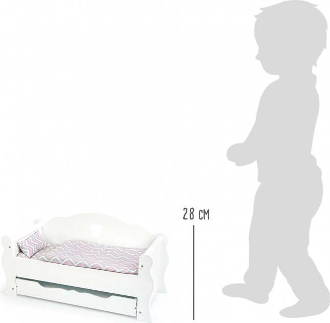 Bijeli drveni krevetić za lutke Small Foot idealan je dodatak za svaku malu princezu. S robusnom konstrukcijom i elegantnim dizajnom pruža udobnost lutkama i plišancima. Funkcionalno se može pretvoriti u malu sofuu te ima ladicu za pohranu.