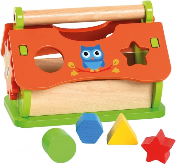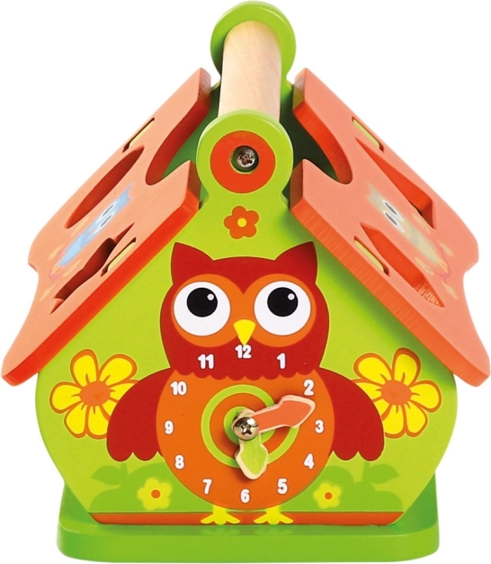 Otkrijte univerzalnu drvenu slagalicu u obliku kućice koja razvija dječju maštu i vještine. Zahvaljujući pokretnom krovu, satu sa sovom i šarenim oblicima potiče finu motoriku, prepoznavanje oblika i boja te orijentaciju u vremenu. Robusna drvena izrada i praktična ručka osiguravaju sigurnu igru i lako prenošenje.