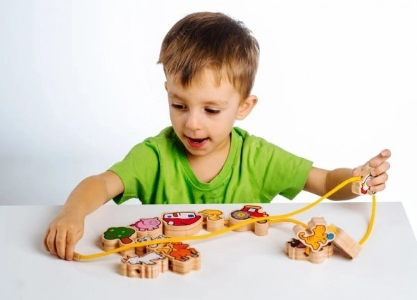Set sadrži 12 drvenih dijelova, drvenu iglu, pamučnu uzicu i drvenu kopču. Vesele i šarene teme osmišljene su tako da zaokupe dječju pažnju te budu izvrsno pomagalo za učenje i igru.