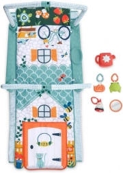 U kompletu je pet odvojivih aktivnosti: sigurno zrcalce, zvečka žabica, BPA-free grickalica pužić, šuškavi vilenjak i njihajuća kantica. Elektronička svjetleća kantica nudi kratki i dugi način rada, do 20 minuta glazbe, zvukova i šarenih svjetalaca. Podloga je mekana, prostrana i periva u perilici, pa lako održavate čisto i higijensko okruženje za igru.