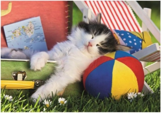 Šarena slika uspavanog mačića s loptom motivira djecu na slaganje i ukrašava svaku dječju sobu.