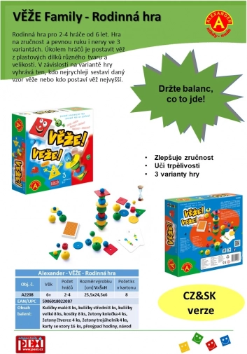 Zabavna obiteljska igra za 2–4 igrača od 6 godina, u kojoj iskušavate strpljenje, preciznost i spretnost. Gradite tornjeve od raznoliko oblikovanih dijelova u tri natjecateljske varijante i uživajte u napetosti i smijehu. Držite ravnotežu koliko god možete – pobjeđuje onaj tko najbrže sagradi zadani uzorak ili izgradi najviši stabilni toranj.