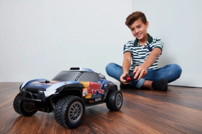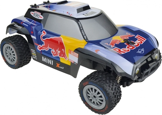 Dvokanalni model automobila na daljinsko upravljanje X-Raid MINI JCW Buggy Red Bull 1:16, frekvencija 2,4 GHz. Može voziti do 10 natjecatelja istovremeno. 30,5 x 11,5 x 17 cm. Na baterije: automobil 4 x LR6 AA (1,5 V), upravljač 1 x 6LF22 (9 V).