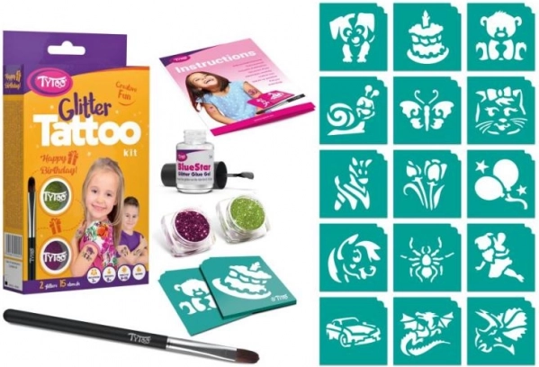 Stvorite jedinstvenu atmosferu na rođendanskoj zabavi sa svjetlucavim tetovažama TyToo Happy Birthday. Set sadrži 15 šablona veselih motiva i 2 boje šljokica koje na koži traju otprilike 8–18 dana. Tetovaže su vodootporne, ali se lako uklanjaju alkoholom ili dječjim uljem. Gotove motive možete dodatno ukrasiti samoljepljivim kamenčićima ili pokretnim očima za još izraženiji efekt.