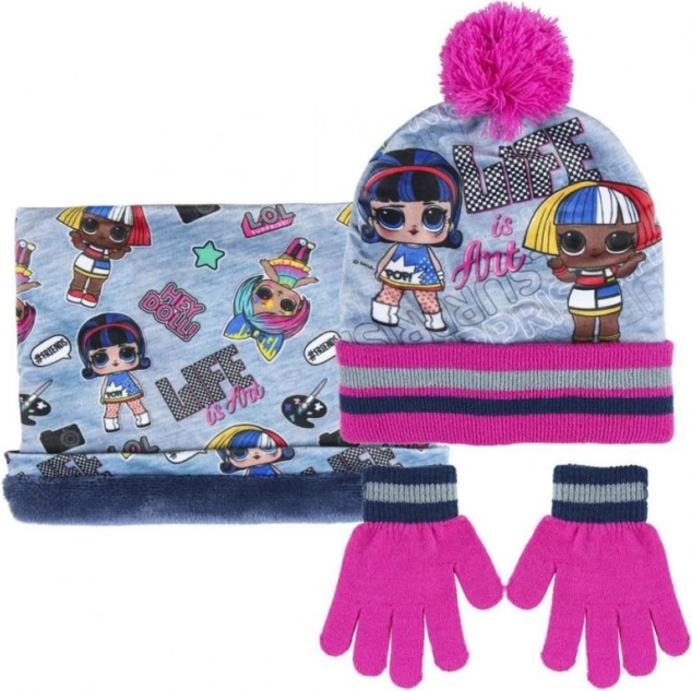 Zimski set L.O.L. za djecu: kapa, ogrlica za vrat i rukavice u univerzalnoj veličini. Moderan licencirani dizajn, udobnost i toplina za djecu od 3 godine.