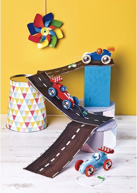 Preslatki vučni trkaći autić od lakiranog drva u tirkiznoj boji s crvenim krilom razveselit će male vozače od 18 mjeseci. Potiče ravnotežu i koordinaciju pokreta, proizveden je u Francuskoj i zahvaljujući kompaktnim dimenzijama 16 × 9 × 9 cm djeca ga lako nose na svaku avanturu.
