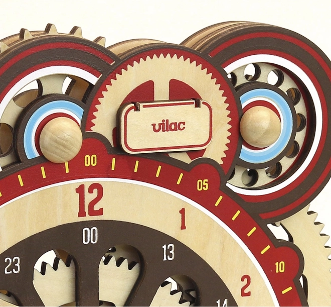Drveni didaktički sat VILAC na zabavan način provodi djecu kroz svijet vremena. Analogni brojčanik nadopunjuje koturačni brojčanik koji oponaša digitalni prikaz i olakšava snalaženje. Obje kazaljke i brojčanik međusobno su povezani preciznim prijenosima, pa mehanika vjerno odgovara stvarnom satu – to pomaže boljem razumijevanju odnosa između minuta i sati.