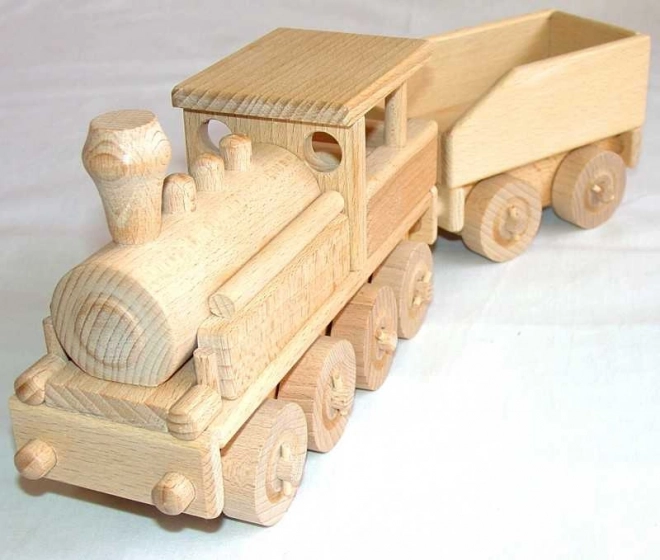 Ovaj drveni model parne lokomotive oduševljava preciznom izradom bukovog drva i prirodnim dizajnom naglašenim samo voskanjem i poliranjem. Lokomotiva ima pokretne kotače i dizajnirana je bez oštrih rubova, što osigurava sigurnu igru za djecu. Zahvaljujući tome prikladna je ne samo za igru kod kuće, već i u pješčaniku.