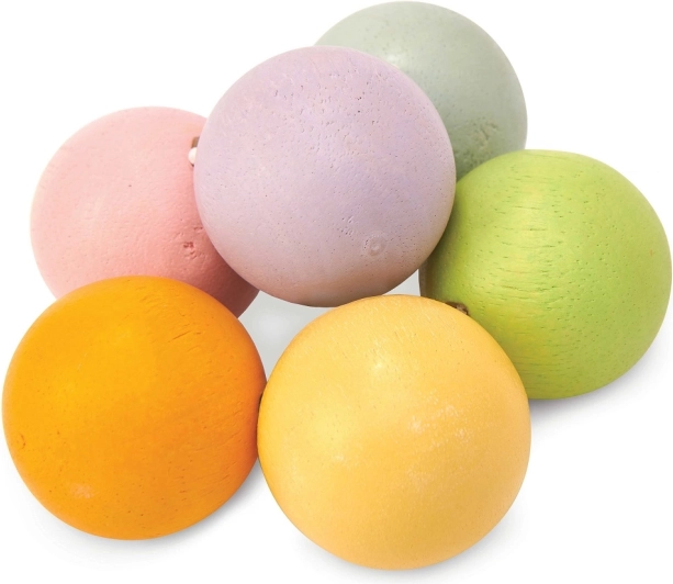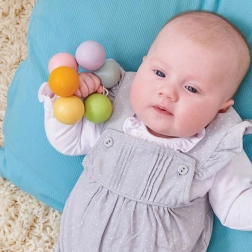 Pastelne drvene kuglice na elastičnoj gumici ugodno leže u ruci i pomažu olakšati osjetljive desni tijekom nicanja zubića.