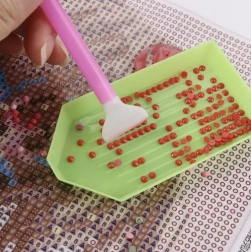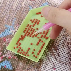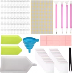 Za udoban rad tu su 4 aplikatora različitih veličina, precizna pinceta, 3 posudice za sortiranje i silikonski sklopivi lijevak za lako presipanje kamenčića bez nereda. Voštani kvadratići osiguravaju siguran prihvat kamenčića, a spatula za poravnavanje pomaže postići savršeno ravan rezultat.