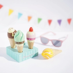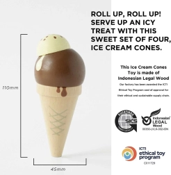 Igra sa sladoledima prirodno razvija kreativnost, društvene vještine i komunikaciju. Čvrsta konstrukcija od održivog drva i etička proizvodnja osiguravaju dugotrajnost i svakodnevnu upotrebu. Zahvaljujući realističnim detaljima djecu potiče na posluživanje, brojanje porcija i osmišljavanje vlastitih okusa.