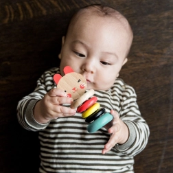 Pružite svojoj bebi sigurnu i senzorno poticajnu igračku. Drveno zvečkalo zeko pri nježnom protresanju proizvodi ugodno kucanje koje umiruje i potiče slušnu percepciju. Zahvaljujući kompaktnim dimenzijama odlično leži u ruci i razvija finu motoriku te koordinaciju ruka-oko.