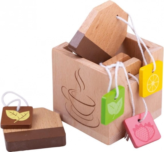 Set drvenih čajnih vrećica idealan je dodatak dječjoj kuhinjici ili trgovini. Stilizirane vrećice s omiljenim okusima potaknut će kreativnu igru i naučiti djecu pravilima stolovanja i uljudnosti pri posluživanju.