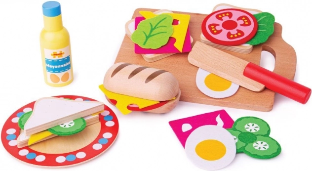 U setu se nalazi sve za pripremu ukusnog sendviča: baget, kriške kruha, majoneza, salata, krastavac, sir, jaje i rajčica, nadopunjeno tanjurom, daskom i nožem. Materijali potječu iz odgovornih izvora i igračka ispunjava europske sigurnosne norme, tako da se na nju možete osloniti.