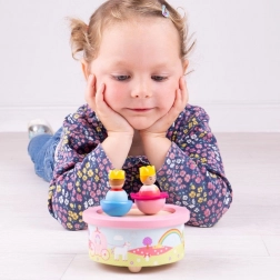 Ova prekrasna drvena glazbena kutijica opremljena je s dvije figurice koje se okreću i njišu u ritmu uspavanke. Figurice su pričvršćene pomoću nevidljivih magneta, što omogućuje njihovo lako odvajanje i samostalnu igru.