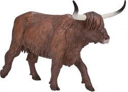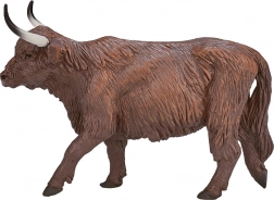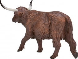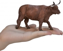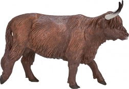 Detaljan plastični model Škotskog visoravnog bika s dugom teksturom krzna i istaknutim rogovima.