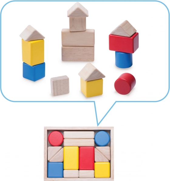 - 6 šarenih zveckajućih kocaka, 7 prirodnih kocaka, drvena kutijica