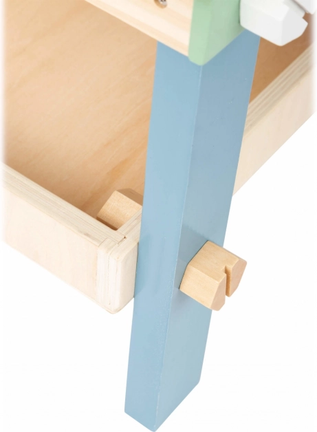 Dio paketa je 21 dio: 5 vijaka, 5 matica, 3 čavla, 5 komada alata i 3 perforirane ploče za vježbanje zavrtanja i zakucavanja. Ne nedostaje škripac i donja polica za sigurno spremanje svih dodataka. Sjajan izbor za dječake i djevojčice od 3 godine.