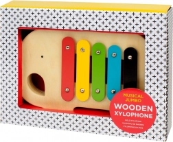 Pet jarko obojenih metalnih pločica na drvenom tijelu u obliku slona poziva na istraživanje tonova i prvu svirku. U kompletu je drvena palica s elastičnim držačem.