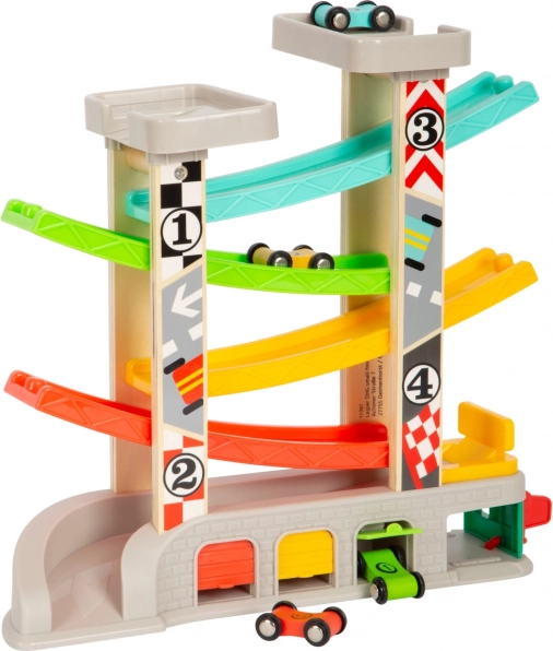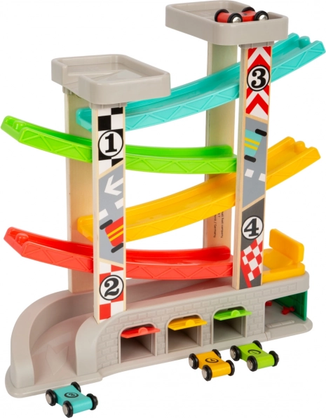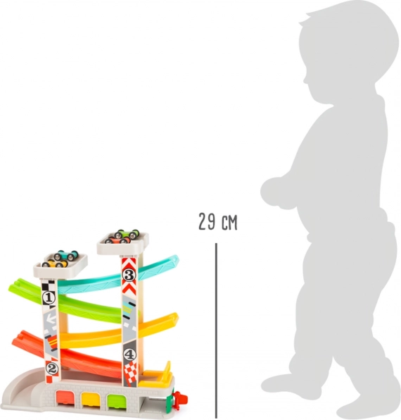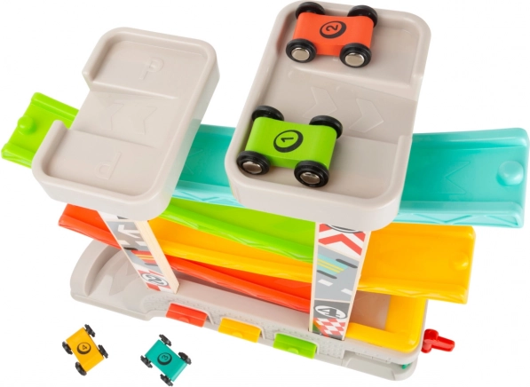 Staza je dizajnirana da razvija vještine imitativnog igranja i finih motoričkih sposobnosti, dok djeca utrkuju s četiri različito obojena autića. Osim toga, zahvaljujući praktičnom sustavu parkiranja i skladištenja, mali trkači mogu svoje autiće lako pospremiti nakon utrke.