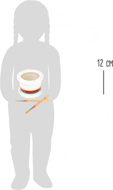 Drveni bubnjić ima bijelu površinsku obradu s duginim prugama i šarenim točkicama.